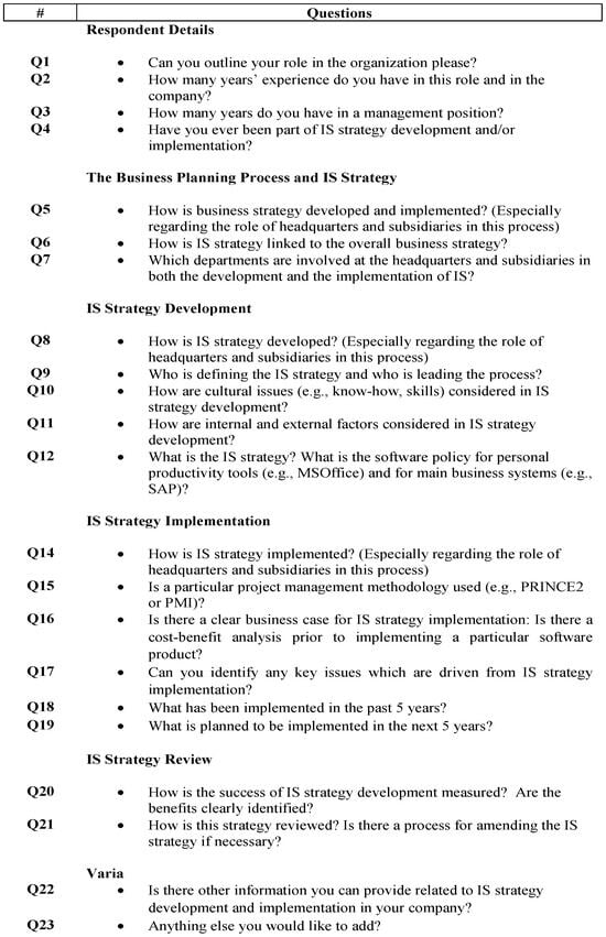 Following the development of the conceptual framework, a questionnaire was designed to elicit information from interviewees that would provide a response to the research questions and allow the population of the conceptual framework to provide appropriate comments and actions to advance the strategy development and implementation cycle. The questionnaire contained 23 questions (Figure 3) and was emailed to the interviewees in advance of the interviews.