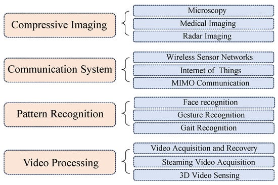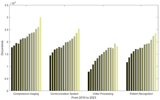 In general, CS is a revolutionary signal-processing technique that hinges on the idea that sparse signals can be accurately reconstructed from a significantly reduced set of measurements. The principle of CS involves capturing a compressed version of a signal, enabling efficient data acquisition and transmission. As the Figure 1 shows, in the field of image processing, numerous works have been proposed in each of various domains, exploring innovative techniques and algorithms to harness the potential of compressive imaging [,,,,,,,,], efficient communication systems [,,,,,,,,], pattern recognition [,,,,,,,,], and video processing tasks [,,,,,,,,]. The versatility and effectiveness of CS make it a compelling area of study with broad implications across different fields of signal processing and information retrieval. Moreover, Figure 2 illustrates the annual publication count of articles related to CS in the four major domains of CS applications in image processing since 2010. It is evident that CS-related research has increasingly become a focal point of attention for researchers. Therefore, a comprehensive and integrated introduction to CS is anticipated. The main contributions of this review are as follows: