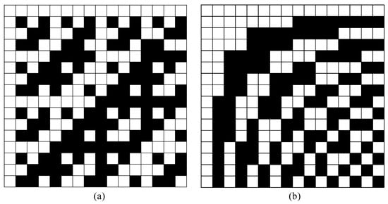 Conventional measurement matrices encompass multiple categories, ranging from random matrices to deterministic matrices, each contributing uniquely to the applications in CS. Random matrices are constructed by randomly selecting elements from a certain probability distribution, such as the random Gaussian matrix (RGM) [] and random binary matrix (RBM) []. The well-known traditional deterministic matrices include the Bernoulli matrix [], Hadamard matrix [], Walsh matrix [], and Toplitz matrix []. Figure 4 gives an example of two famous deterministic matrices.
