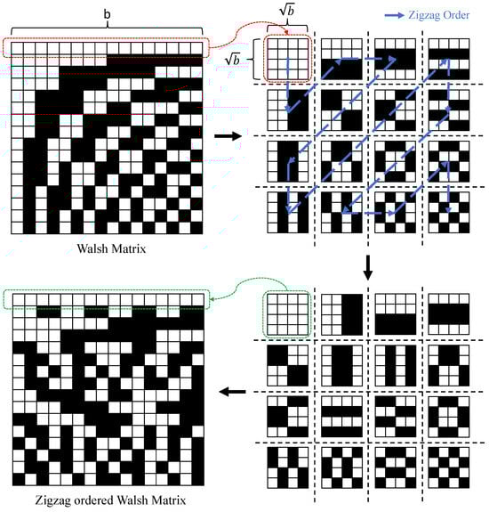 Although these deterministic matrices have been extensively researched and successfully applied to the CS camera, because of their good sensing performance, fast reconstruction, and hardware-friendly properties, they are insupportable when applied to the ultra-low CS ratio []. Moreover, for instance, in the work of [], the information of the pixel domain can be obtained by changing a few rows in the matrix, but the modified matrix results in an unacceptable reconstruction performance, posing enormous challenges for practical applications. In recent years, some studies have been carried out to investigate the effect of Hadamard and Walsh projection order selection on image reconstruction quality by reordering orthogonal matrices [,,,,]. A Hadamard-based Russian-doll ordering matrix is proposed in [], which sorts the projection patterns by increasing the number of zero-crossing components. In the works of [,], the authors present a matrix, called the cake-cutting ordering of Hadamard, which can optimally reorder the deterministic Hadamard basis. More recently, the work of [] designs a novel hardware-friendly matrix named the Zigzag-ordered Walsh (ZoW). Specifically, the ZoW matrix uses the zigzag to reorder the blocks from the Walsh matrix, and, finally, vectored them. The illustration of the process is shown in Figure 5.
