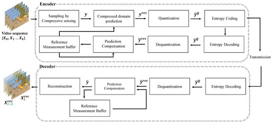 Regarding the measurement coding in video-oriented CS, the spatial and temporal redundancy in measurement has become a primary concern that is necessary to further compress. Accordingly, a novel work with inter prediction is proposed to further reduce the spatial redundancy in measurements while still maintaining visual quality []. In [], the authors divide the type of measurement into two portions: static measurement as the non-moving part and dynamic measurement as the moving part in the pixel domain. In general, the information of consecutive frames is similar, resulting in temporal redundancy. To further reduce the bandwidth usage, quantization is a straightforward approach, such as scalar feedback quantization (SFQ). However, the output from CS is represented in a compressed vector, in which an existing video compression algorithm could not be used. Therefore, the work of [] designs a temporal redundancy reduction method in video CS over the communication channel, which can be shown in Figure 7.