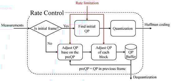 The work of [] develops a frame adaptive rate control scheme for video CS. Figure 8 illustrates the part of rate control in their proposed framework. In a nutshell, the rate limitation will lead the first frame to find an initial value of QP by their proposed triangle threshold-based quantization method and guide the subsequent frames to adjust the QP based on the predicted QP. The paper of [] is the extended version of [] that was described before. In [], the authors further propose the rate control algorithm using an iterative approach. They consider that the reconstruction quality and the encoded bit-rate mainly rely on two parameters, the CS ratio and the quantization step size. Therefore, they design a rate control algorithm to further process the residuals between measurements and predictions, in order to generate a coded bit sequence for transmitting. As a result, with a component of rate control, their proposed framework can compress the measurements and increase coding efficiency significantly with excellent reconstruction quality, leading to a smaller bandwidth required in communication systems.