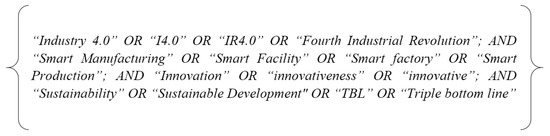 In this study, we structured our search terms according to the established “population” and “intervention” framework [72]. For the population, we focused on the scope of application, which, in our case, is “IR4.0”, while the “intervention” included BCT innovation and sustainable manufacturing. An initial pilot search with a few selected phrases revealed that some yielded irrelevant results. Notably, the acronym “IR4.0” proved far more prevalent than “Fourth Industrial Revolution” in the literature. Building on these preliminary findings and consultations with information retrieval bibliographers, we opted for the broader term “sustainable manufacturing facilities” to encompass a wide range of sustainability concepts, including “triple bottom line” (TBL), “circular economy”, and “sustainable development”. Similarly, we used terms like “smart manufacturing” and “smart factories” to capture the development of smart and sustainable manufacturing facilities. The final search string (as shown in Figure 3) was, thus, developed to address the key questions of this investigation within its defined scope.