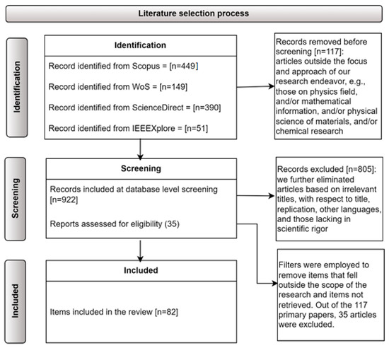 Following the application of a series of filters based on the aforementioned criteria, each article was meticulously assessed by the authors, leading to a unanimous decision regarding its “inclusion or exclusion”. A stringent selection process was employed to identify pertinent articles. Filters were employed to remove items (articles) that fell outside the scope of the research. Of the initial 117 primary papers, 35 articles were excluded due to their insufficient coverage of IR4.0 innovation outcomes in terms of processes, products, and other relevant aspects. The final selection for data extraction and analysis consisted of 82 articles.