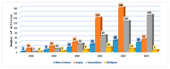 This literature review employed four electronic databases—“IEEEXplore, ScienceDirect, Web of Science, and SCOPUS”—to gather scholarly papers. These databases represent the most extensive and appropriate collections for our research endeavor, as demonstrated by different scholars (e.g., [72,74]). Our keyword searches targeted “article titles and abstracts” to gather as much pertinent literature as possible on IR4.0 innovation, sustainability, and smart manufacturing. We identified a total of (1039) items in the four databases. Each of the outcomes of the search was then entered into a “Microsoft Excel spreadsheet”. In phase 1, the collected documents were classified by the “date of publication” (2018–2023). Following the guidelines of the PRISMA declaration [75]. Figure 4 illustrates “the literature selection approach” used in this study. Moreover, Table 2 and Figure 5 show that the items identified in the four databases were found relevant for further exploration.