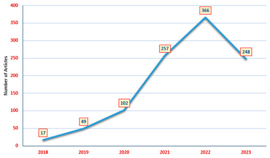 Our final set of data for the current study included 82 research articles published between 2018 and August 2023. We limited our search to studies published after 2018, as this topic has gained significant traction within the academic and professional communities [1]. Nonetheless, our findings suggest that academic discussions and debates about the influence of IR4.0 innovation on the development of smart and sustainable manufacturing facilities likely began earlier, possibly around 2017. Since then, the amount of new research on this subject has skyrocketed, highlighting the growing interest among scholars in the critical and pertinent domain of digitalization, IR4.0 and IR5.0 innovations, and their connections to sustainability. Figure 6 below illustrates this trend of increasing publications over time.