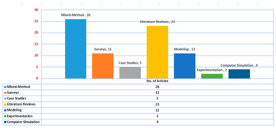 Given the importance of research methods, we observed a variety of techniques used to explore the link between IR4.0 innovation (specifically BCT) and the sustainability of smart manufacturing facilities. As shown in Figure 7, mixed-method studies (combined qualitative and quantitative approaches) are the most prevalent (n = 26), followed by surveys (n = 11), case studies (n = 5), literature reviews/conceptual studies (n = 23), modeling studies (n = 11), and a smaller number of studies employing experimentation (n = 2) and computer simulation (n = 4). These results indicate that the present study’s theme has received academic focus from both qualitative and quantitative standpoints. Theoretical and review articles have explained how IR4.0 technologies, with particular emphasis on BCT, influence various forms of innovations for sustainable development, while case studies have largely endorsed hypothetical concepts with empirical applications. Conversely, experimentation, prototyping, and simulation methods need to be utilized to help assess design problems and recommend effective solutions.
