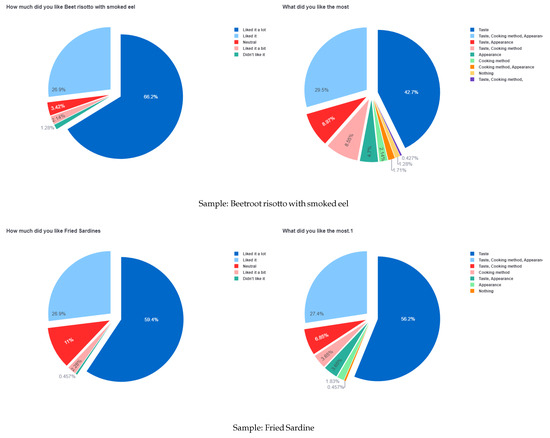 In our final observation of the first survey results, the information collected and displayed in Table 7 describes that the most liked sample with the highest endorsement percentage was beet risotto with smoked eel; however, the least endorsed sample was fried sardines. Based on the observed results, the customers focused their attention onto the taste and looks and not significantly to the nutritional value of the sample. Whilst both samples are high in nutritional value, sardines contain a high amount of omega-3 fatty acids, which are considered to be healthy fats. On the other hand, the sample beet risotto with smoked eel contains a variety of vitamins such as minerals or antioxidants; however, it might also contain increased fat or calorie content based on the preparation of the sample (added butter, oil contents).