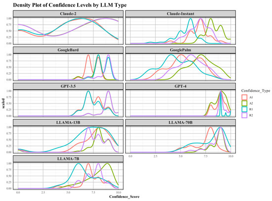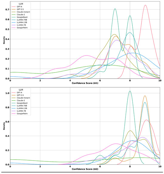Even though Google-Bard generally outperformed Google-PaLM across the board, both models maintained consistent confidence metrics. In addition, models GPT-3.5 and 4 also encompassed high mean confidence levels. GPT-4 showed a mean A1 confidence score of 8.9 with a standard deviation of 0.568. Among the LLaMA series, variability in confidence levels was more noticeable. LLaMA-13B had a standard deviation of 2.06 for A1, which is higher, while the series LLaMA-70B and LLaMA-7B were in the range of 1.12 and 1.21, respectively. The findings here describe in detail the self-assessed confidence levels of various LLMs. The density plots in upcoming sections will further illustrate the trends, with the curves’ variations in width and height implying the observed mean and variability of the confidence levels. These results underscore the fact that our analysis considered both central tendency and dispersion for the self-assessment mechanisms of LLMs.