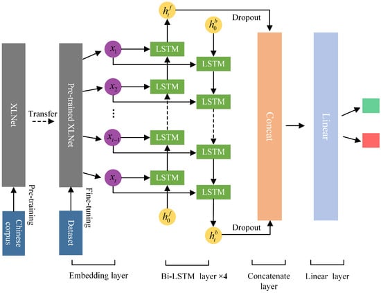 Therefore, this research proposes a hybrid detection model based on XLNet and deep Bi-LSTM. The proposed model structure is shown in Figure 1. Algorithm 1 illustrates the detection model and training process. The detection model consists of three key components: representation learning, encoding and classification. The overall approach of pre-training + fine-tuning is adopted for training. The XLNet-Chinese version [35] is used as the embedding layer for representation learning to generate feature vectors for contextual information, which is obtained by pre-training the XLNet model with a large number of Chinese corpora, such as Chinese Wikipedia and Q&A. The token and location information of the detected speech are processed by tokenizer and input to the pre-trained XLNet model. After being encoded by the two-stream self-attention mechanism, the hidden state of the last layer is used as the input of the Bi-LSTM layer. The forward and backward direction sequences of the hidden state of the last layer of XLNet are input to the deeper Bi-LSTM for further encoding, and a dropout layer is added to alleviate overfitting. Next, the concatenate layer connects the LSTM hidden states of forward and backward direction sequences at time step t to obtain the bi-directional information combining the context of the input sequences. Finally, the judgment of cyberbullying speech on the internet is obtained after dimensionality reduction by the linear layer.
