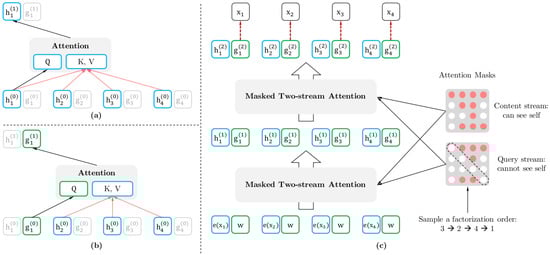 To address the lack of target position information in the transformer model, the position information of the current predicted token is introduced into the model, as shown in Equation (2), and two-stream self-attention is designed to solve the representation problem in the model by introducing two sets of hidden representations, content and query. Content hidden representation is shown in Figure 2a, which encodes the context and the content and position of the current prediction word. It is consistent with the standard transformer. The query hidden representation is shown in Figure 2b, which encodes only the context and positional information of the current prediction word, but not the content information of the current prediction word. The computation process of two-stream self-attention is shown in Figure 2c. Content hidden state is set to word embedding, while query hidden state is initialized to trainable variables, which is fed into self-attention and computed layer-by-layer. The last layer of the query hidden state is used to compute the Equation (2). For the fine-tuning stage of the downstream task, the query stream can be discarded and only the content stream is used.