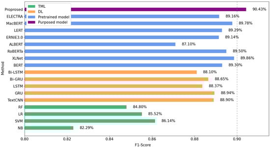 In summary, the F1-score of the proposed model reaches 90.43% on COLDATASET*. As shown in Figure 6, it improves 4.29% compared to SVM, which is the best performer in traditional machine learning (TML) methods. It improves 1.49% compared to GRU, which is the best performer in deep learning (DL) methods. And there is a 1.13% improvement over BERT. The proposed model further improves on XLNet by 0.57% and outperforms all baseline models on this dataset with good performance.