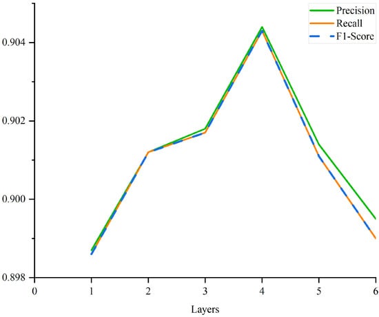 Table 3 shows the results of the ablation studies. On one hand, TextCNN, LSTM, GRU and Bi-GRU are used to replace Bi-LSTM. On the other hand, the number of layers of the bidirectional recurrent neural network is deepened to observe the performance of the detection model. The results show that the proposed hybrid model achieves the best performance at a layer number of four for Bi-LSTM, outperforming all baselines. As shown in Figure 5, to some extent, the performance of the model can become better as the number of layers of the network is deepened, but it does not lead to a sustained improvement. The performance decreases when the model is too deep.