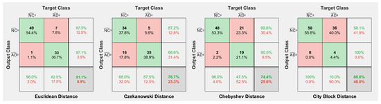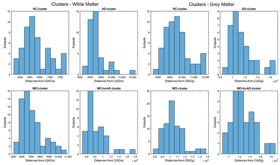 - Moving to the -to- predictive capability of the K-means model restricted to significant pixels, again we found different percentages according to the considered white or gray matter in the considered two-year time span. As expected, analyzing the white matter a high percentage of , namely, (Table 2), showed an pattern-like decay, similar to what was detected in [16,17,18] on the same dataset. So, our result, with a time span of two years, was slightly below the results presented in [20], where after one year only 8 of 37 patients with converted to (22%), verifying the reduction in the regional glucose metabolic rate, a truthful signal of early-onset .This high percentage of pattern in could be attributed to the similarly located decay of white matter in the two classes of subjects, as reported in [43]. This study involved 23 , 15 , and 15 subjects that underwent diffusion tensor magnetic resonance imaging (DTI), an advanced MRI technique extremely sensitive to white matter alterations. The authors found that patients with had an increase in mean diffusivity in the limbic, interhemispheric, cortico-cortical, and corticospinal tracts and, similarly, patients with showed an increase in axial diffusivity only in tracts projecting to the frontal cortex and splenium of the corpus callosum.On the other hand, time passing caused a milder effect on the gray matter of subjects, whose analysis revealed only 29% of -to- cases (see Table 3),, in accordance with the more optimistic studies in the work of [8], obtained through using machine learning techniques on fMRI images.Table 2 and Table 3 report the obtained statistics on the classification performance of subjects, together with the related indexes. In Figure 6, the distributions of subjects’ distances within the clusters show smaller distances between the subjects and the related centroids when white matter is considered with respect to gray matter. This implies that the classification using white matter produces tighter clusters and, consequently, a stronger accuracy than gray matter. All the clusters show some borderline subjects that produce small local maxima while moving away from the centroids. However, the computation of the Dunn indexes showed the high reliability of the obtained clustering. Again, we underline that the small diameter of the cluster may also be due to the smaller variability in the age range of the subjects. However, this does not constitute an issue in the final results of the research.