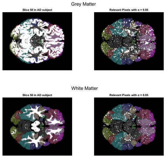 - We have introduced the notion of significant pixels, i.e., the pixels of the MRI images where the white (resp. gray) matter decays in the considered two-year time span, significantly differ between and subjects. The number of significant pixels, in the brain slices where the phenomenon mostly appeared, according to the different values obtained after performing a permutation test on all the pixels of the images, i.e., , , and , was about 4%, 2%, and 1.5% of the totality of the white matter and slightly more, i.e., 6%, 4%, and 2.5%, of the totality of the gray matter. Such a small number of significant pixels is sufficient to discriminate between and , as reported in Table 2 and Table 3, using the K-means clustering technique. Not surprisingly, when considering the white matter, all the and subjects were correctly clustered, i.e., the white matter decay of subjects significantly differed from that of ones. On the other hand, when considering gray matter, the subjects were correctly classified, while 6 of the 40 subjects were assigned to the class, with a percentage of error of 15%. This can be ascribed to the fact that Alzheimer’s disease strongly impacts on the white matter first, and later leads to the decay of the gray matter.We also underline that, according to the wide and consolidated literature, the most involved areas of the brain affected by Alzheimer’s decay are the medial portion of the temporal lobe, where the hippocampus, amygdala, entoryl cortex, and parahippocampal cortex reside. These areas are located inside the selected slice intervals where most of the significant pixels were detected. As an example, Figure 7 shows the significant pixels of slice 58, where a peak in the white and gray matter occurred, with the involved brain areas highlighted.