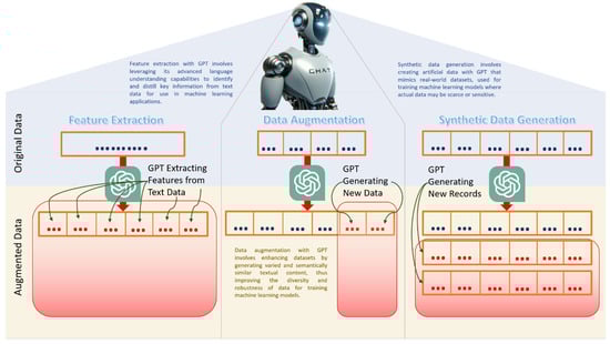 Notwithstanding the concerns associated with the authoring aspect of research, the review at hand strategically narrows its focus to explore alternative dimensions of GPT and LLM applications in scholarly pursuits. Specifically, the examination focuses on data augmentation, where GPT and LLMs play a pivotal role in enhancing research data, generating features, and synthesizing data [10,11,12]. As shown in Figure 1, with GPT’s advanced language understanding capabilities, features can be extracted from plain text information. It should be noted that previously, feature extraction from plain texts involved various natural language processing techniques like entity recognition, sentiment analysis, classification, and others, as shown in [13,14,15,16,17,18]. With the introduction of GPT and associated technologies, a simple prompt can extract various features from plain text (Figure 1). Moreover, as depicted in Figure 1. Semantically similar content could be added by GPT being part of the data augmentation process, improving the diversity and robustness of the data. Furthermore, rows of data could be synthetically generated by GPT, facilitating the training of the machine learning process during times of data scarcity or confidentiality (shown in Figure 1).