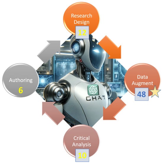In Figure 2, the systematic literature review adeptly highlights the central focus on data augmentation with GPT, encapsulating 45 highly pertinent scholarly contributions. Beyond this primary focus, the study delves into the proactive role of GPT in facilitating critical analysis of research data [22,23,24,25] and shaping research design [26,27,28]. Significantly advancing the scholarly discourse, this study pioneers the development of a comprehensive classification framework for “GPT’s use of research data”, marking a seminal contribution. By critically scrutinizing existing research works on data augmentation, the review uniquely establishes a classification system encompassing six overarching categories and 14 sub-categories, providing a systematic and insightful perspective on the multifaceted applications of GPT in research data. Furthermore, the judicious placement of all 45 seminal works within these meticulously defined sub-categories serves as a sagacious validation of the intellectual rigor and innovation inherent in this classification framework, thereby substantiating its rationale and scholarly significance. Ultimately, the meticulous comparative analysis of 54 extant literary works, rigorously evaluating research domains, methodological approaches, and attendant advantages and disadvantages, provides profound insights to scientists and researchers contemplating the seamless integration of GPT across diverse phases of their scholarly endeavors.