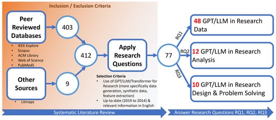 In the recent literature landscape, various reviews have emerged concerning the adoption of GPT in research [19,20,21]. However, a critical research gap persists, as none of these reviews comprehensively explores GPT’s substantial capacity and capability in the realms of generating, processing, and analyzing research data. To address this significant void, this literature review meticulously scrutinizes 412 scholarly works, employing rigorous exclusion criteria to distill a curated selection of 77 research contributions. These selected studies specifically address three pivotal research questions, delineated as follows: