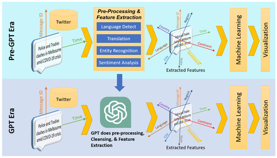 - Feature Extraction and NER: This encompasses the use of GPT for identifying salient features within unstructured data and enhancing named entity recognition (NER) capabilities [33,38,43]. As shown in Figure 6, prior to the era of GPT, various NLP techniques like entity recognition, sentiment analysis, and category classifications were used for extracting features from textual data like social media posts, as shown in [13,14,15,16,17,18]. Then these extracted features were used by machine learning techniques for obtaining insights and analytics. However, with the advent of GPT, features could be extracted with a simple GPT prompt like “Categorize these data into the following categories (1) animals, (2) plants, and (3) equipment,” as shown in Figure 5.