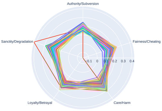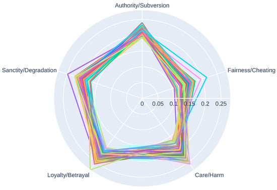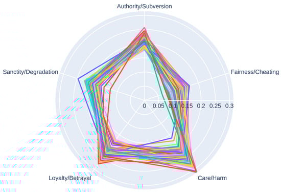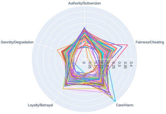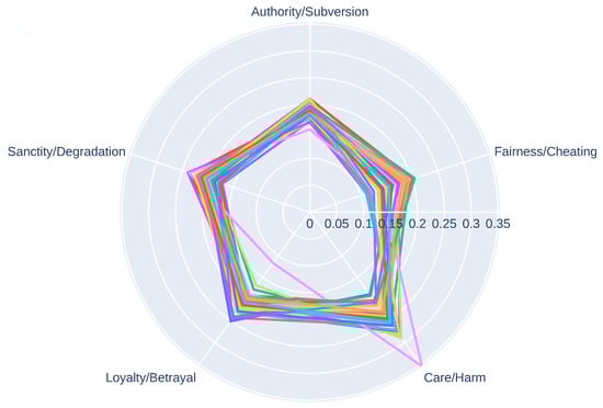 As you can see, [11] used a couple of terms to define each foundation. The terms in each couple were akin in most cases, but, in the case of Harm/Care, they seemed to identify opposite extremes of the same moral value. Similar couples of opposites have been identified in [23] for the other foundations as well, such as Fairness/Cheating, Loyalty/Betrayal, Authority/Subversion, and Sanctity/Degradation. In the following, we opt for the more recent formulation based on a couple of extremes for each moral foundation, as proposed at https://moralfoundations.org (accessed on 18 January 2024).