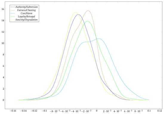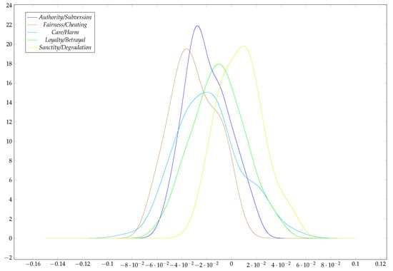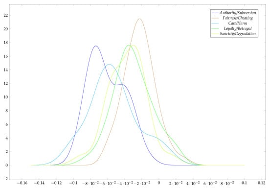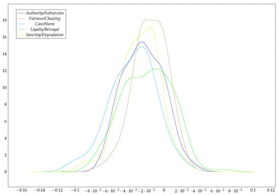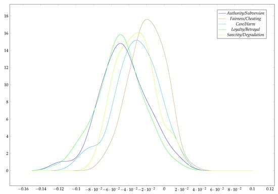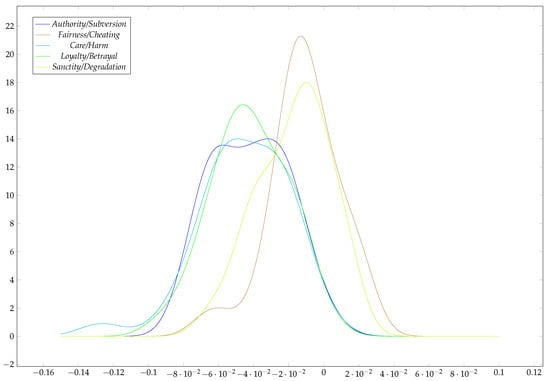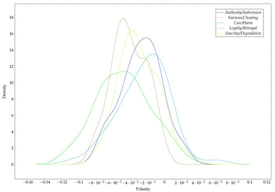 We can perform a similar analysis by separately examining the lexicon pertaining to the positive and negative facets of each moral dimension, as described in Section 2.2. If we represent the pertaining presence as and , respectively, for the j-th moral dimension in the i-th episode, we can obtain a measure of the prevalence of the positive over the negative polarity by computing the difference . If the difference is positive, the positive polarity (virtue) will be considered the dominant facet of that foundation; vice versa, the negative polarity (vice) will be considered the dominant one. Since we obtain a polarity value for each episode, we will plot the estimated probability density of polarity. For the empirical probability density function, we have employed the density function in R, which employs the Gaussian kernel method described by [51]. More precisely, the algorithm used in that function disperses the mass of the empirical distribution function over a regular grid of at least 512 points and then uses fast Fourier transform to convolve this approximation with a discretized version of the kernel and then uses a linear approximation to evaluate the density at the specified points. The bandwidth employed in the kernel method is determined as in [52].