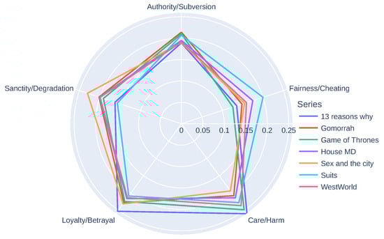 An established classification of moral features has been set through Moral Foundations Theory [11] (MFT), which posits five universal moral foundations— Harm/Care, Fairness/Reciprocity, Ingroup/Loyalty, Authority/Respect, and Purity/Sanctity. This theoretical framework has been largely used to analyze the presence of moral content in traditional media (books and songs) as well as relatively recent ones (movies and video games) [12,13,14]. However, no attempts have been made in the literature to employ it in the context of TV series. The growing relevance of this entertainment outlet for the formation of popular culture poses a spurring need for its analysis.