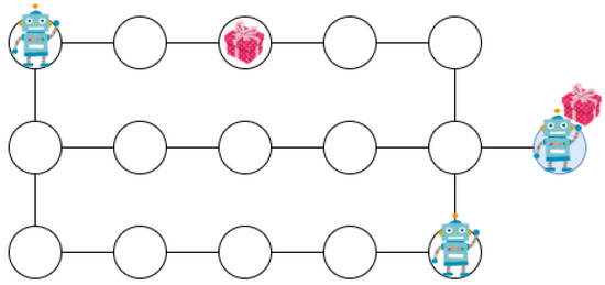 In the target problem’s environment, movements that cause agents to collide with each other fail, and the agents that fail to move remain in place. Given the actions of all agents, we can determine the next position of each agent using Algorithms 1 and 2. Here, the function returns the next position (ignoring collisions) when the agent whose current position is selects action a. represents the number of the agent whose current position is ( if none exists), and is the set of agents attempting to move to . In Algorithm 1, the function receives each agent’s current position and action, and it returns each agent’s next position. First, for each agent d, we and initialize to record whether the movement fails, set the next position when collisions are ignored in , and update and (lines 1–7). Then, for each agent d, if has not been called, we call , and if the movement fails, we set to (lines 8–15). The function in Algorithm 2 determines whether agent d can move. First, if another agent is attempting to move to the same vertex as agent d, agent d fails to move (lines 2–6). In the following, we assume that this is not the case. If no agent is at the destination of agent d, agent d can move (lines 7–11). When agent c is at the destination of agent d, if agent c fails to move, agent d also fails to move (line 21). Thus, the decision is made recursively while tracing the agent at the destination (lines 12–14). However, if a loop occurs, the movement will fail (lines 15–19). This rule also prohibits movements that involve agents passing each other.