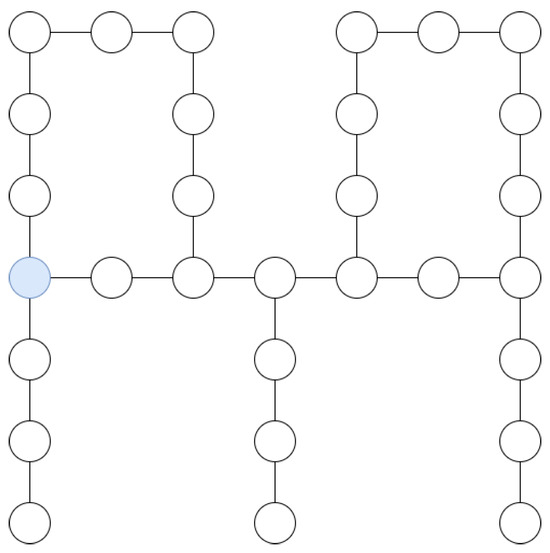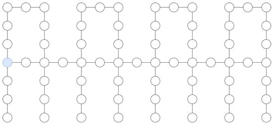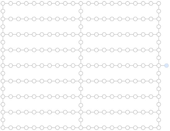 Three types of grid graphs for warehouses were used in our tests: warehouse-small (30 nodes), warehouse-medium (66 nodes), and warehouse-large (214 nodes). Each graph is shown in Figure 3, Figure 4 and Figure 5, respectively. In these figures, the blue nodes represent the depots.