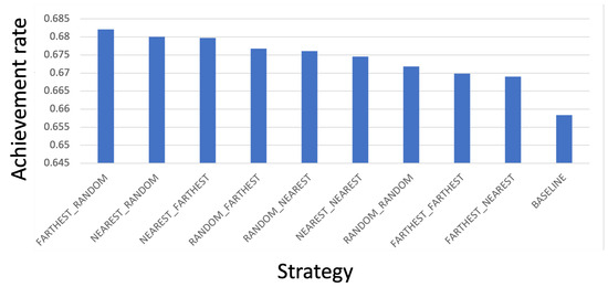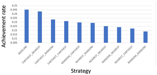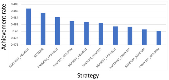 The results of the simulation tests for the warehouse-medium case are shown in Figure 7. The achievement rates for the different strategies are ranked in descending order as follows: FARTHEST_NEAREST, BASELINE, RANDOM_FARTHEST, NEAREST_RANDOM, NEAREST_NEAREST, RANDOM_NEAREST, NEAREST_FARTHEST, FARTHEST_FARTHEST, RANDOM_RANDOM, and FARTHEST_RANDOM. The achievement rate of FARTHEST_NEAREST was higher than BASELINE, which demonstrates that the item-exchange process is effective. However, unlike the warehouse-small case, most strategies could not exceed the BASELINE because, as warehouses become larger, the average distance from the depot to items increases, and the time limit is reached by collecting items close to the depot. In addition, the reason the achievement rate was higher than the BASELINE only when FARTHEST_NEAREST was utilized is summarized follows. The achievement rate is increased due to the transport of far-off parcels among them relatively close to the depot that would normally not be carried within the time limit.