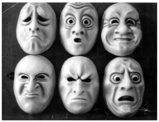 Facial expression recognition (FER) is a method of detecting human emotions from static images or videos to disclose information about humans’ facial expressions or emotional states. In [], Ekman, and in [,], Friesen postulated six primary emotions and discussed their distinct characteristics. People of all races and civilizations share these prototypical emotional displays, often referred to as basic emotions. Thus, to identify human emotions, the key lies in facial expression. In reality, not all facial expressions have significance and can be mapped to emotions, but there are six fundamental emotions (in Figure 1) that are universal [] and can be represented in the same manner.