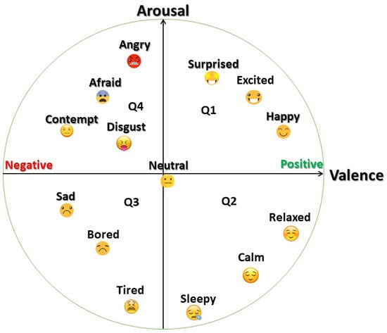 The arousal and valence factors vary from positive to negative. Also, the positive states are in the right hemisphere, and the negative ones are in the left. Emotional states can be easily defined in 4 different quadrants (Q1–Q4), including high arousal–high valence (Q1), high arousal–low valence (Q2), low arousal–low valence (Q3), and low arousal–high valence (Q4), respectively [].
