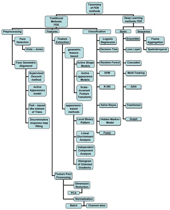 In Figure 3, the taxonomy of the paper methods is illustrated. Initially, the evolution timeline is presented; after that, the traditional methods, the deep learning methods, the state-of-the-art core of this paper, and a detailed analysis of datasets in FER are shown.