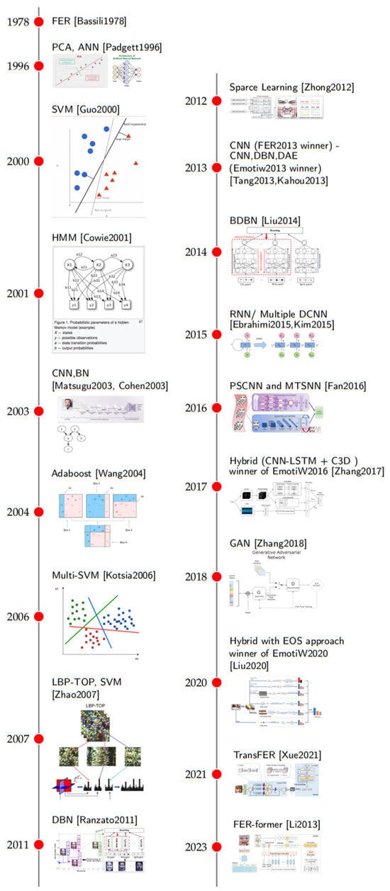 Evolution timeline of methods. List of papers in the image [Bassili1978] [], [Padgett1996] [], [Guo2000] [], [Cowie2001] [], [Matsugu2003, Cohen2003] [,], [Wang2004] [], [Kotsia2006] [], [Zhao2007] [], [Ranzato2011] [], [Zhong2012] [], [Tang2013,Kahou2013] [,], [Liu2014] [], [Ebrahimi2015,Kim2015] [,], [Fan2016] [], [Zhang2017] [], [Zhang2018] [], [Liu2020] [], [Xue2021] [], [Li2023] [].