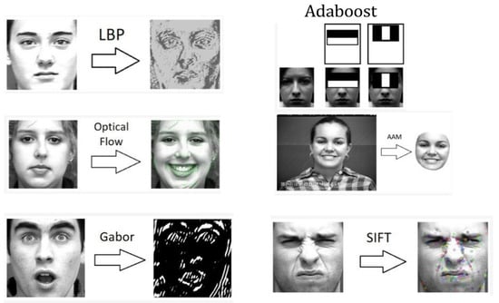Some feature extraction methods from top to bottom and from the right to the left LBP, Adaboost, Optical Flow, AAM, Gabor, and SIFT [].