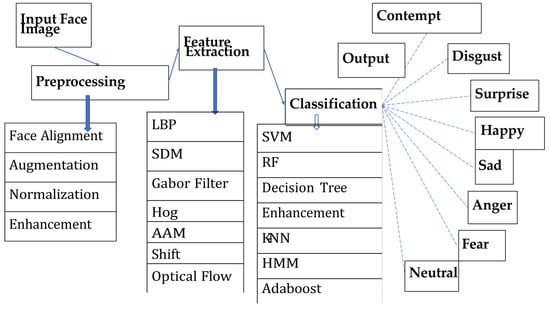 The classification stage [] is a crucial component in the FER system, where the classifier is trained on known datasets to recognize facial expressions in unknown datasets during testing. Although classical approaches for FER have been successful in achieving a high accuracy, they come with high processing costs and are still widely used. The goal of the classifier is to accurately categorize expressions such as happy, sad, surprised, angry, fearful, disgusted, and neutral into their respective labels. There are many classical methods employed in the classification stage, including Linear Discriminant Analysis (LDA) [], Decision Trees (DT) [], K-Nearest Neighbor (KNN) [], Fuzzy [], Adaboost [], Hidden Markov Model (HMM) [], Bayesian Network (BN) [], Sparse Representation-based Classification (SRC) [], and Support Vector Machines (SVM) [,], among others. An overview of the traditional facial expression recognition stages is depicted in Figure 7.