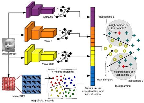 The forms and placements of face components, such as the brows, eyes, nose, mouth, and chin, are described by geometric facial characteristics. Geometric-feature-based approaches seek to extract face characteristics by utilizing the geometric correlations between facial feature locations. On the other hand, appearance-based methods use the whole face or specific regions in a face image to reflect the information in a face image. Some techniques of geometric-feature-based methods are Active Shape Models (ASM) [], Active appearance Models (AAM) [], and Scale-Invariant Feature Transform (SIFT) [,]. For appearance-based methods, most well-known techniques are LBP (Local Binary Pattern) [], Weighted Projection-based LBP (WPLBP) [], Gabor wavelet [], Histogram of Oriented Gradients (HOG) [,], Principal Component Analysis (PCA) [,,], Facial Action Code (FAC) [], Linear Discriminant Analysis (LDA) [], Independent Component Analysis (ICA) [,], Supervised Descent Method (SDM) [], Three Orthogonal Planes (LBP-TOP) [], and Pyramid Histogram of Visual Words (PHOW) [], etc. For feature extraction, the Gabor filter, WPLBP, SDM, WLD, and HOG are the most commonly used, but most traditional methods are based on LBP, which gives improved results.