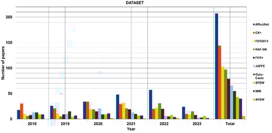 Facial emotion recognition was initially presented in work proposed by Bassili [] in 1978. Bassili et al. investigated the influence of facial motion on perceiving faces and emotional expressions. They explored how dynamic changes in facial features, like eye and mouth movements, impact the recognition and interpretation of emotions. The study offers insights into the role of motion in understanding human emotions (six fundamental emotions: happiness, sadness, fear, surprise, anger, and disgust). In Figure 4, the evolution timeline of facial expression recognition methods is illustrated. Numerous FER algorithms have been developed, encompassing both traditional methods and deep learning (DL) algorithms, with many state-of-the-art methods in both categories. Moreover, in Figure 5, a brief overview of the evolution timeline for the datasets is given, in which the terms IC (image controlled), IU (image uncontrolled), SC (sequence controlled), and SU (sequence uncontrolled) refer to different types of datasets commonly used in the context of FER. To clarify each dataset, we will label them as IC, IU, SC, and SU.