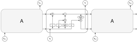 The architecture of Long Short-term Memory (LSTM) neural networks represents a sophisticated structure that differs from traditional feedforward neural networks. The core of this architecture is the LSTM cell, which is equipped with a series of specific gates that enable precise control of the flow of information [35]. These gates and their functionality are key to understanding the LSTM’s ability to model long-term dependencies. In Figure 1, we can see a graphic representation of the architecture of an LSTM cell [36], and below are presented in detail the mathematical formulas that describe the operation and interactions within the LSTM cell, providing a deeper understanding of each architecture component.