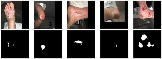 The challenge dataset consists of 1210 foot ulcer images taken from 889 patients. The first row contains some examples of the raw images collected. The second row consists of the corresponding segmentation masks.