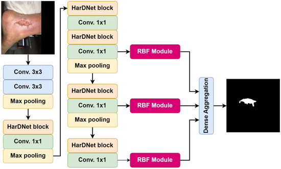 The architecture of HarDNet-MSEG [20]. Conv.: convolutional layer. RBF: receptive field block.
