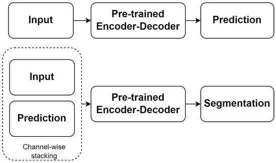 Pre-trained double encoder–decoder network [24]. The second network receives input as the original raw image concatenated with the prediction of the first network. This allows the second network to better focus on the region of interest in the image, improving its segmentation accuracy.