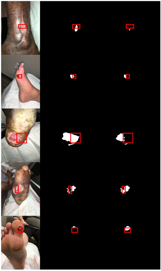 Cases with small isolated wound areas. The left column shows the original images. The middle column shows the ground truth label and the right column shows the segmentation predictions.