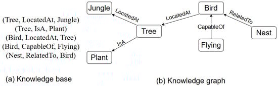 Figure 1a) example, knowledge is represented in the form of factual triples. Triples comprise the subject, predicate, and object. For example, Bird, locatedAt, and Tree. In triples, a relationship between subject and object is established through the predicate.