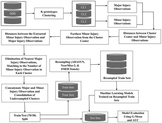 After under-sampling the major injury observations, the major injury observations were concatenated with the minor injury observations for each cluster. Subsequently, the under-sampled clusters were concatenated. Then, the ODS and cluster-based under-sampled data set (CUDS) were split into train and test sets using a 70/30 ratio. Later, the train sets were resampled using ADASYN, NearMiss-2, and SMOTETomek. Four machine learning models were trained on the resampled train sets. Lastly, the models were tested on the test sets and evaluated using G-Mean and AUC scores. Figure 1 shows the resampling process and model development workflow.