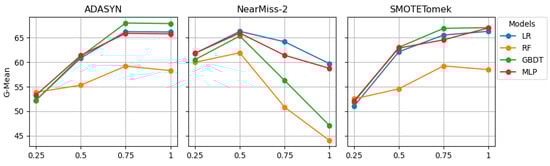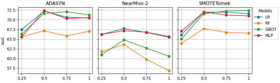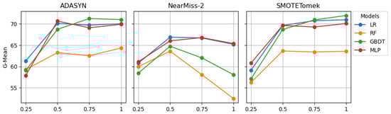 Figure 3 and Figure 4 graphically present the results from Table 5. The G-Mean line plots for ADASYN and SMOTETomek indicate that the G-Mean scores of LR, GBDT, and MLP were likely to increase sharply when the sampling ratio was increased from 0.25 to 0.75. Beyond 0.75, further increases in the sampling ratio were less likely to affect their G-Mean scores. The AUC scores of LR, GBDT, and MLP were also likely to follow a similar pattern. While increasing the sampling from 0.25 to 0.75, the G-Mean and AUC scores of RF also increased but not as sharply as for the other models. After reaching 0.75, the G-Mean and AUC scores of RF decreased slightly.