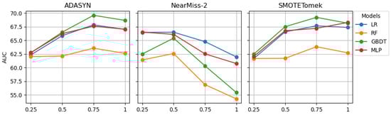 Figure 5 and Figure 6 depict the G-Mean and AUC scores outlined in Table 7 through line plots. The G-Mean line plots for ADASYN and SMOTETomek suggest that increasing the sampling ratio from 0.25 to 0.50 is likely to result in a sharp increase in the G-Mean scores for the LR, GBDT, and MLP models. The rise in G-Mean scores for RF was less pronounced compared with the other models. The AUC line plots for ADASYN and SMOTETomek exhibit a similar trend. Further increasing the sampling from 0.50 to 1 is less likely to yield significant changes in the G-Mean and AUC scores of the models.