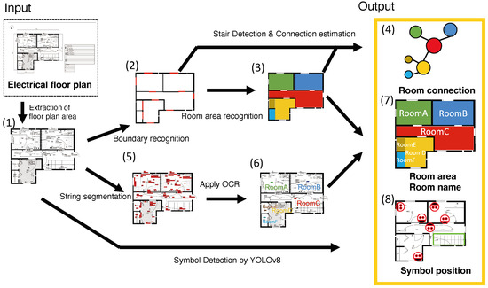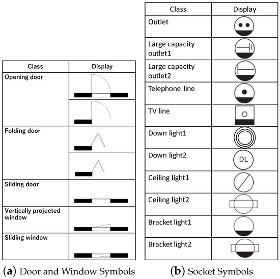 In recent years, advances in image analysis and deep learning technologies have expanded the potential applications of floor plans, enabling tasks such as the extraction of structural information [1] and the generation of floor plans [2]. With such digitized and extracted information, we can make floor plan databases searchable and improve their accessibility [3,4], which is beneficial for house designers, architects, and interior planners, as well as real estate agents and customers. In addition, if floor plans contain the location and types of wall and ceiling sockets, and if we can extract such information, they will become more usable in various applications, e.g., we may enjoy designing furniture and appliance placement on the floor plan, based on the socket locations and types. Such a floor plan with wall and ceiling sockets is called an electrical equipment installation plan, or electrical plan for simplicity. Generally, the architects who design and build houses retain such information as CAD data. However, it may sometimes happen that only copied images of the floor plans are available after those houses are built due to copyright or some other issues. Therefore, the structural, semantic, and electric equipment information in the original CAD data has been lost or unavailable, although there is a certain need for leveraging such information. It is desirable to detect as much information as possible from images. However, electrical plans also contain much information, e.g., designer names, building materials, fire prevention specifications, and exterior wall color schemes, that is unnecessary for the abovementioned applications. Moreover, many symbols and lines are used to represent the sockets and wiring among them, and they often overlap with each other in the limited space. These features compromise recognition algorithms, and, consequently, applying the existing floor plan recognition methods [1] that have been designed for general, simple floor plan images is not straightforward.