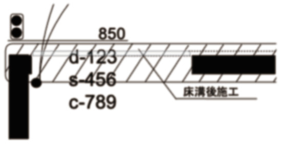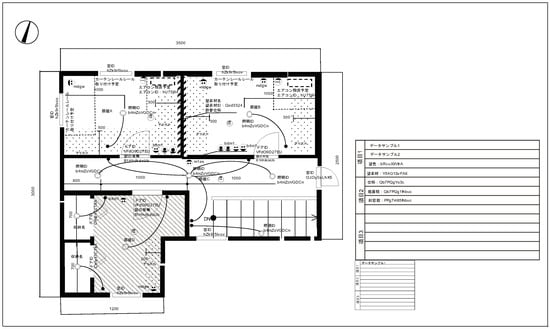 We note that the image has been modified and simplified for anonymity due to the contract with the company that provided the 544 image dataset, and the ones in the dataset contain much more information, such as the walls’ materials and the door type IDs. In addition, the masked tables on the right side initially show the designer’s information, building materials, fire prevention specifications, and the color scheme of the exterior walls. In electrical plans, thick black lines are used for walls; in most cases, room names are written in the corresponding rooms. In addition, doors, windows, and electrical outlets are drawn. Since the space is too limited to accommodate all the symbols, lines, and other objects, they often overlap. Figure 4 shows a case that is difficult to recognize. In this case, double lines represent a sliding door, and the oblique lines and texts overlap. Such overlaps often happen in an electrical plan, which compromises the recognition algorithm.