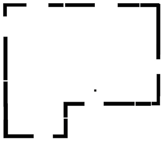 Figure 6b is still just an image with thin and thick lines, and we apply line segment detection to recognize the exterior and interior walls. Firstly, we apply the Canny method to the image to detect edges with just interior and exterior walls and then a Line Segment Detector (LSD, [24]) to detect line segments. Then, we pick up two parallel line segments with a common x-coordinate or a y-coordinate. Considering that thick black lines represent inner and outer walls, we can consider the area between the two line segments with the same x-coordinate or y-coordinate to be the wall if the black density of the area is sufficiently high. Therefore, we can recognize a wall that satisfies the above conditions from the detected two line segments. Assuming that the two lines are from the same wall, we obtain the wall’s thickness, angle, and coordinates. We note that some convexity may correspond to a door or window on the wall. This information is recorded for further analysis, as explained in the following section.