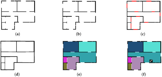 Illustrative example of room recognition: (a) exterior and interior wall detection; (b) noise reduction; (c) door and window detection, where walls are painted black, while doors and windows are painted red.; (d) black lines for room detection; (e) room detection, where each room is painted in a different color; (f) stair detection.
